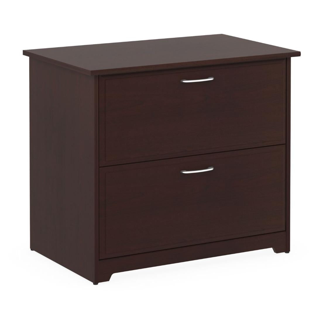This 2-Drawer Lateral File Cabinet in Cherry Wood Finish is the perfect complement to any Bush Cabot Collection Desk. The file stands the same height as the desk work surfaces so it can be used to expand your work area while offering plenty of filing space for letter, legal and AA-size files.
