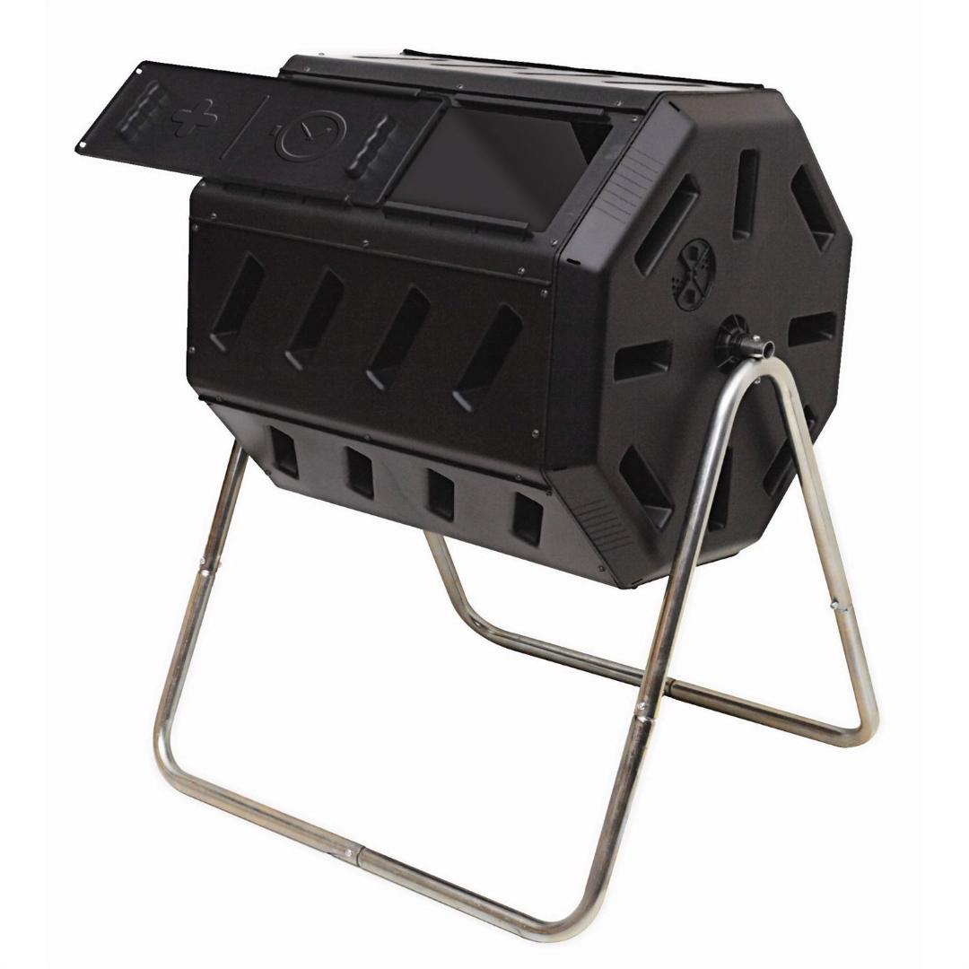 Yimby is an acronym for "Yes in my backyard." Yimby home and garden products help promote environmental responsibility, sustainability, well being and overall enjoyment of home and garden. This 37-Gallon Tumbling Compost Bin Tumbler Composter - 5 Cu. Ft. features two chambers, fill one side while the other side cures, making it easy to efficiently convert your kitchen and yard waste into rich soil enhancing compost. Just load it up, close the sliding door and use the convenient built- in hand holds to give it a turn every couple days and see how it produces finished compost in weeks. The tumbling composter is made with recycled, up inhibited, black plastic which absorbs heat and is designed to be rodent-proof. Help divert waste from landfill or costly processing and turn your own organic waste into compost in your own backyard.