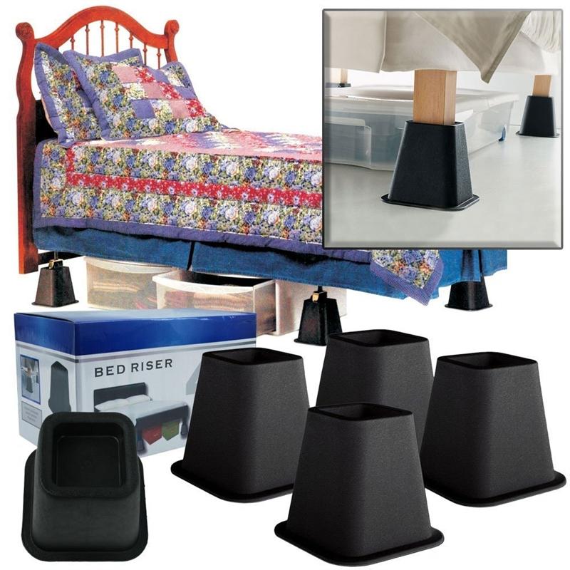 This 6-inch High Bed Risers in Black - 4-Pack will give you storage space you never had before. These sturdy blocks instantly elevate your bed for up to 6-Inch of additional under-bed storage space, perfect for those extra large storage bins. They are engineered to be incredibly strong, and can also be used to aid in the treatment of some medical conditions. These bed risers are perfect for any dorm room setting.