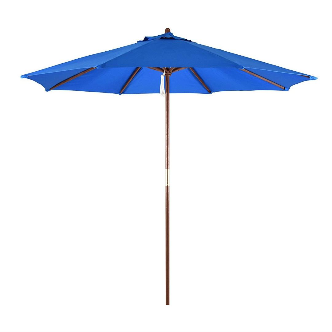 This 9-Ft Pulley Patio Umbrella with Pacific Blue Canopy would be a great addition to your home. It has a classic design with all wood and an aluminum frame.