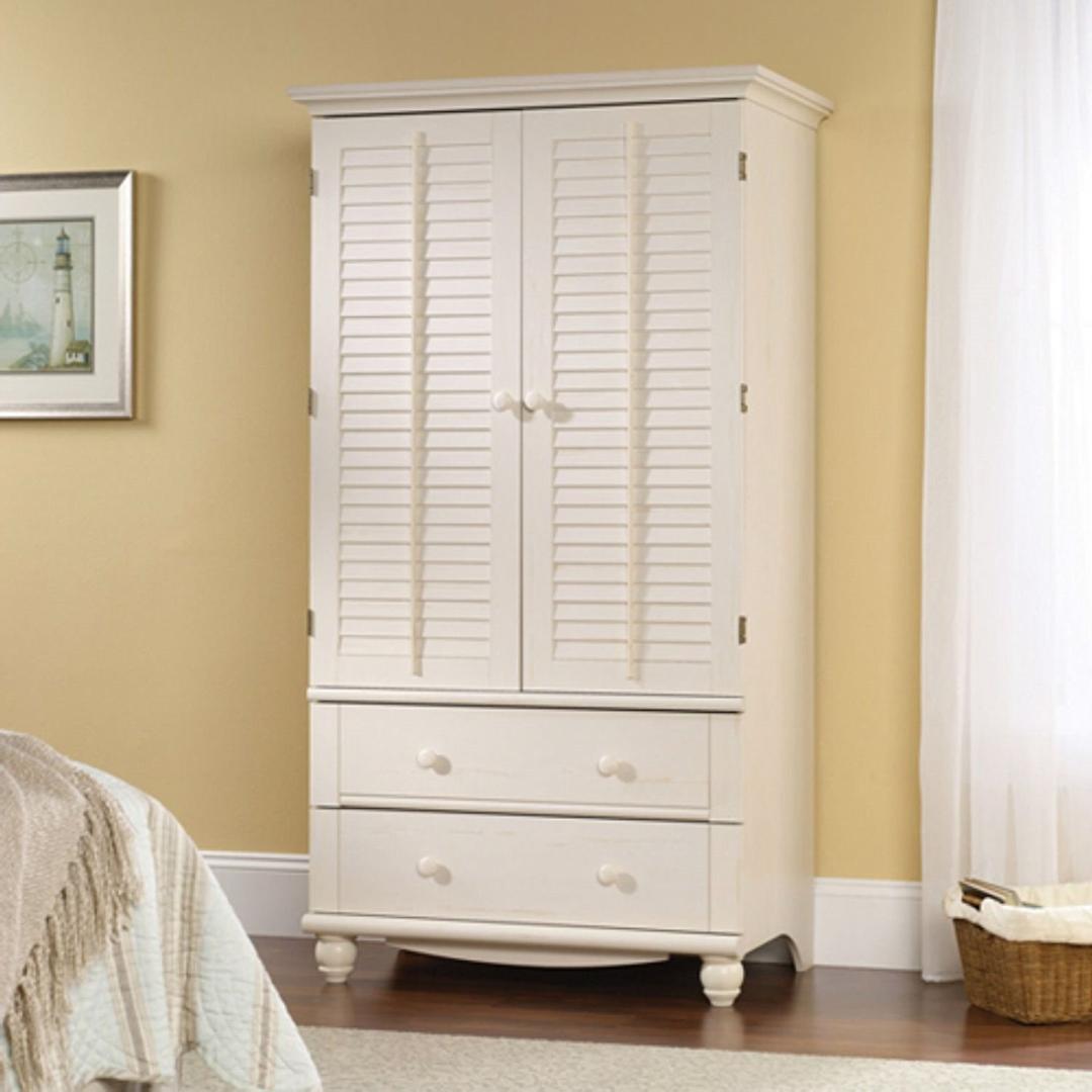 Give your bedroom a fresh new look with this Bedroom Wardrobe Cabinet Storage Armoire with Louver Doors in White. Behind its louver detailed doors, it features a garment hanging rod and storage cubbyholes for your plethora of clothes and shoes. Switch it up and use it as a TV stand that accommodates up to a 32” TV. Two spacious drawers hold clothing and blankets or movies and games. It’s Antiqued White finish and solid wood turned feet will make your bedroom feel brand new.