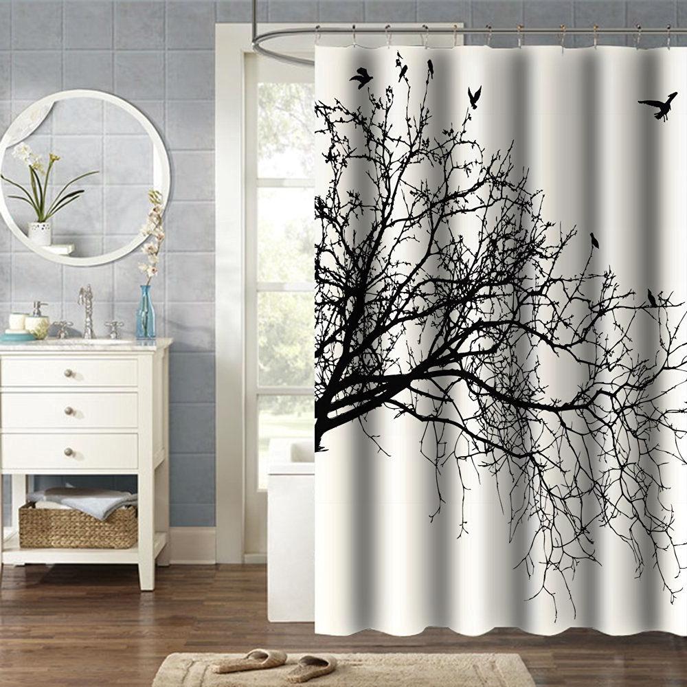 - Birds in Tree Black White Shower Curtain in Polyester Fabric