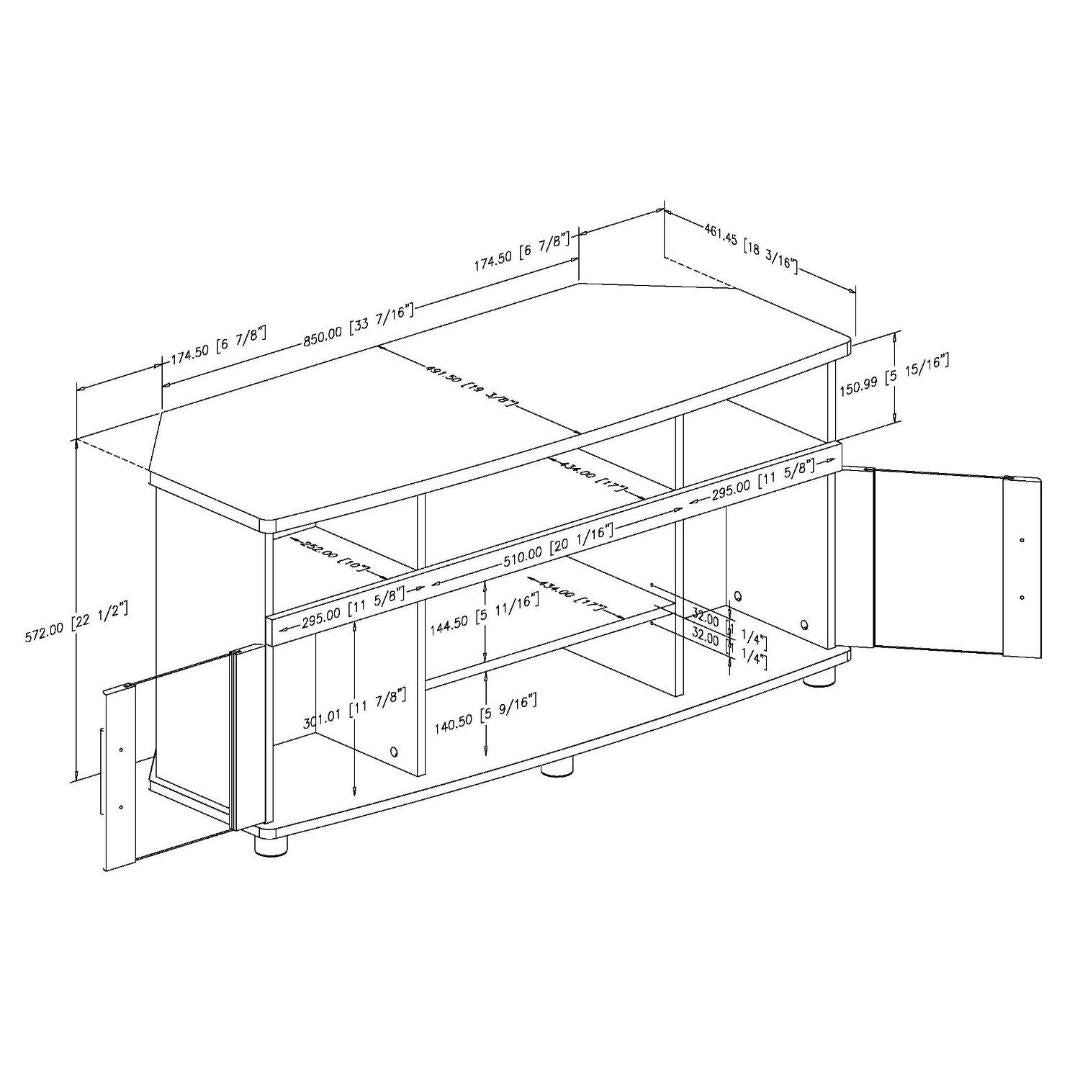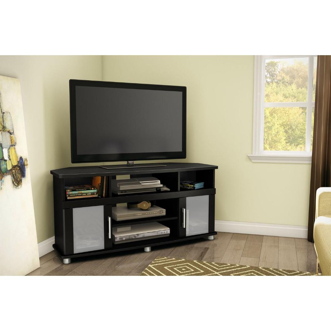 This Black Corner TV Stand with Frosted Glass Doors in pure black finish combines curved lines, silver finish metal handles and frosted glass doors for popular contemporary style. It is a perfect blend of form and function, featuring both open and closed storage options. The living room has never been so tidy and organized. It can accommodate a tv up to 50-inch and its weight capacity is 150-pound. For complete interior dimensions see spec sheet. Also available in chocolate finish. The back is not finished and the accessories are not included. It measures 47-1/4-inch wide by 19-1/4-inch deep by 22-1/2-inch high. It is delivered in a box measuring 53-inch by 23-inch by 7-1/4-inch and weighing 79-pound. Manufactured from certified environmentally preferred laminated particle panels. Complete assembly required by 2 adults. Tools are not included. 5-year limited warranty. Made in Canada.