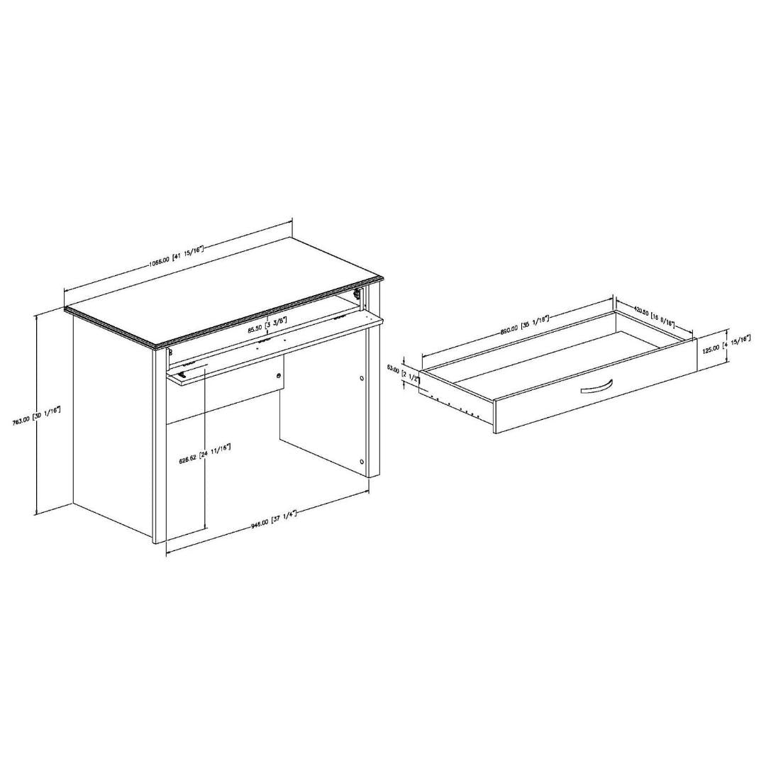 This Black Laptop Computer Desk with Keyboard Tray Drawer features an unfettered design and clean shapes to give the home office a stylized minimalist look. The work surface of this desk is a perfect size for laptop computers, but still large enough to accommodate desktop computers. The sliding keyboard tray is a practical feature, and everything tucks away neatly thanks to the tray’s folding front. It is made of recycled CARB compliant particle panels. Metal glides. It has to be assembled by two adults. Measures 42-inch wide by 19-1/2-inch deep by 30-inch high. It is delivered in one box measuring 46-inch by 22-inch by 6-inch and weights 64-pound. Tools are not included. 5-Year warranty. Made in Canada.