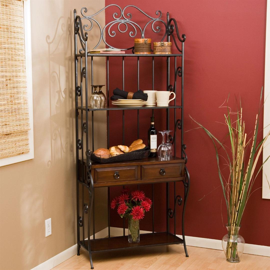 You can't call yourself a real foodie chef if your cooking and baking supplies are stuffed into old drawers and cabinets. That's where this Black Wrought Iron and Walnut Wood Finish Bakers Rack comes in. This rack is the perfect housing unit for a busy cook's tools of the trade. The stunning, intricate wrought-iron frame lends a classic feeling to the rack, while the shelving made of walnut-tinted MDF and pine imparts a rustic feel. The rack's drawers come equipped with exquisite, antique-inspired drawer pulls made of iron, and you don't have to worry about roughly yanking them while on the hunt for an errant rolling pin thanks to convenient, smoothly-sliding drawer pulls.